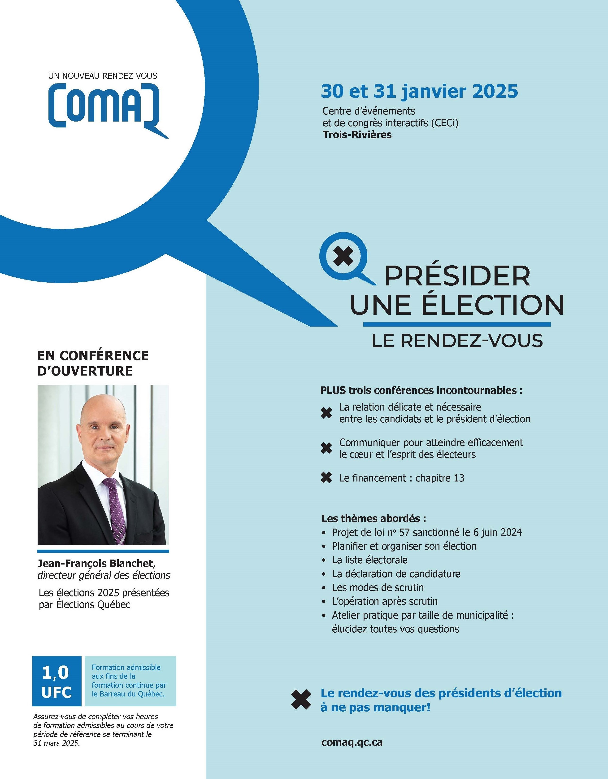 - 8 h 45: Conférence d’ouverture de Jean-François Blanchet, directeur général des élections - Élections Québec